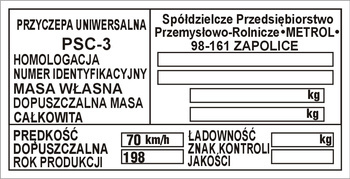 ( ilość produktów: 2 )Tabliczka znamionowa do przyczep producenta Spółdzielcze Przedsiębiorstwo METROL z grawerem